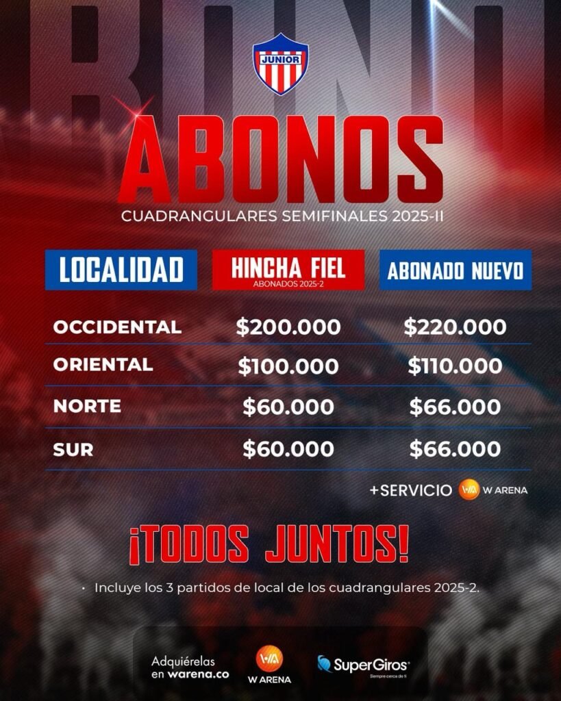 El Junior de Barranquilla anunció oficialmente la venta de los abonos para los cuadrangulares semifinales del segundo semestre de 2025, invitando a toda su afición a vivir la fiesta del fútbol desde el estadio Metropolitano. Bajo el lema “¡Todos juntos!”, el club rojiblanco busca que los hinchas acompañen al equipo en los tres partidos de local que disputará en esta fase definitiva del campeonato.
